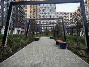 ЖК отличается продуманным благоустройством: прилегающая лесопарковая территория, водоём, образовательные учреждения и спортивные площадки.