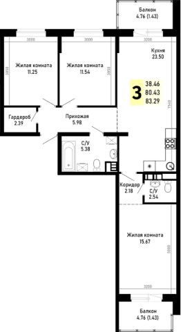 Продаётся 3-комнатная квартира в строящемся доме (квартал 9.2 литер 3), срок сдачи: IV-кв. 2026, общей площадью 83.29 кв.м., на 3 этаже. Новый жилой комплекс по ул. Николая Лебедева от застройщика "ССК"