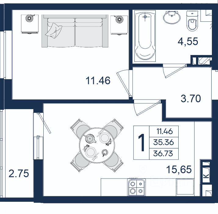 1 комнатная квартира с ремонтом 36.73 м², на 6 этаже в жилом комплексе "Дом 101".