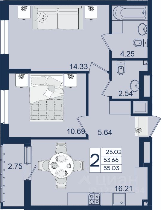 2 комнатная квартира с ремонтом 55.03 м², на 2 этаже в жилом комплексе "Дом 101".