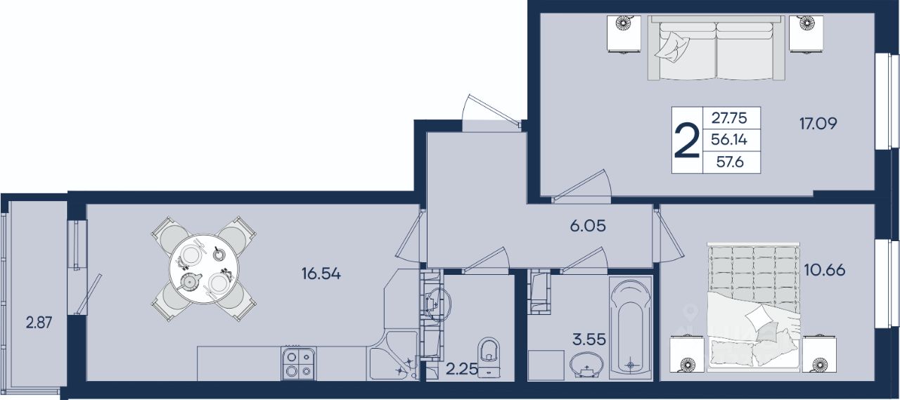 2 комнатная квартира с ремонтом 57.6 м², на 9 этаже в жилом комплексе "Дом 101".