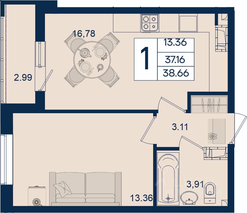 1 комнатная квартира с ремонтом 38.66 м², на 14 этаже в жилом комплексе "Дом 101".