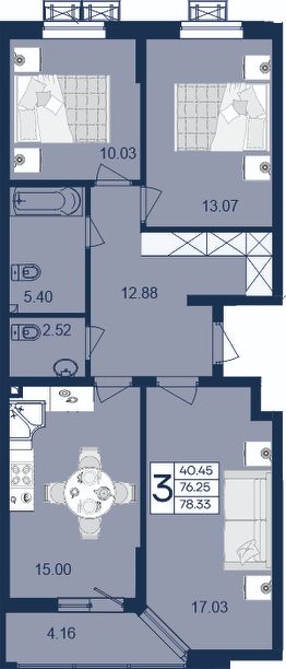 3 комнатная квартира с ремонтом 78.33 м², на 2 этаже в жилом комплексе "Дом 101".