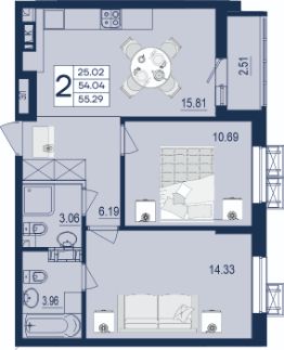 2 комнатная квартира с ремонтом 55.29 м², на 7 этаже в жилом комплексе "Дом 101".