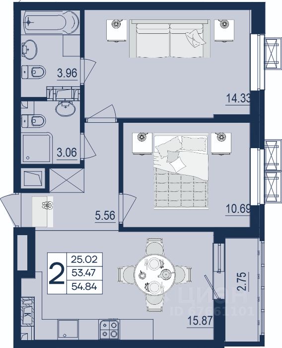 2 комнатная квартира с ремонтом 54.84 м², на 6 этаже в жилом комплексе "Дом 101".