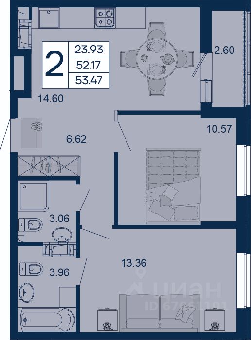 2 комнатная квартира с ремонтом 53.47 м², на 6 этаже в жилом комплексе "Дом 101".