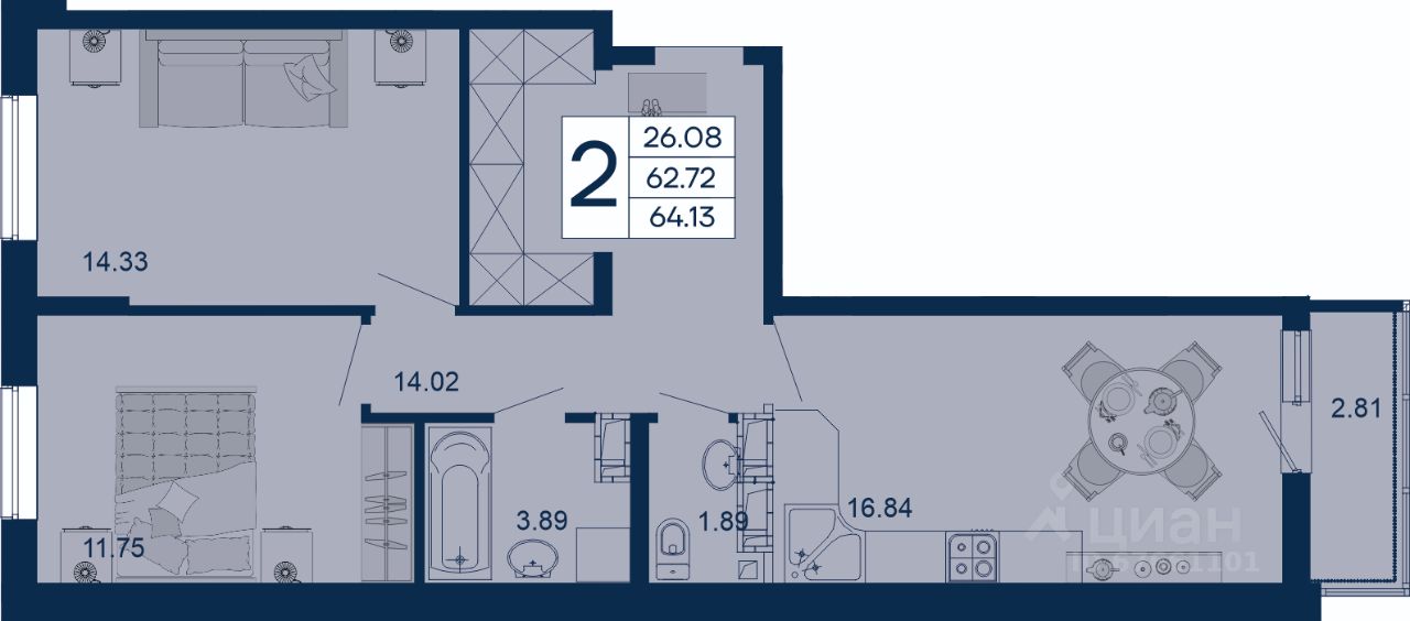 2 комнатная квартира с ремонтом 64.13 м², на 7 этаже в жилом комплексе "Дом 101".