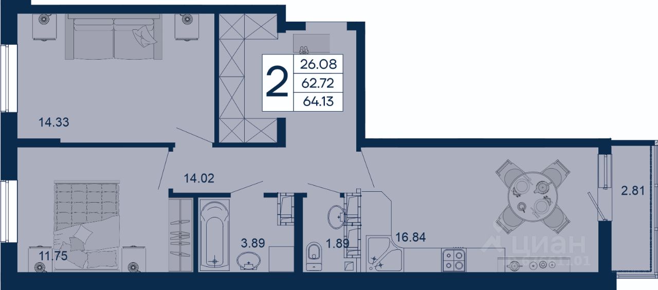 2 комнатная квартира с ремонтом 64.13 м², на 16 этаже в жилом комплексе "Дом 101".