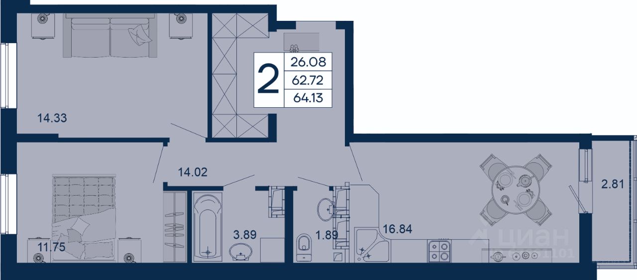 2 комнатная квартира с ремонтом 64.13 м², на 17 этаже в жилом комплексе "Дом 101".