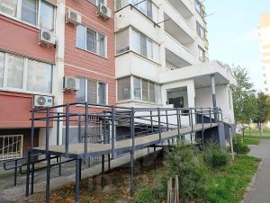 Оборудованный УДОБНЫЙ пандус, ПРОСТОРНЫЙ двор, несколько детских площадок; двор засаженный деревьями и клумбами; вместительная стоянка для автомобилей.