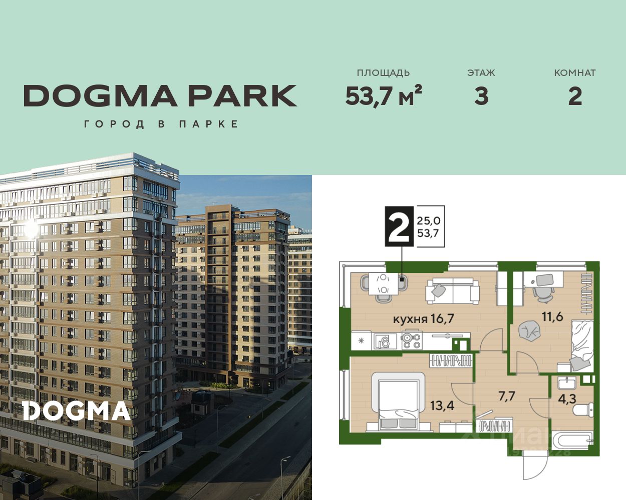 В продаже 2-комнатная квартира от застройщика! Мкр. "DOGMA PARK" г. Краснодар, Литер 18 Срок сдачи: 4 кв. 2027, общей площадью 53.7 кв.м., на 3 этаже.