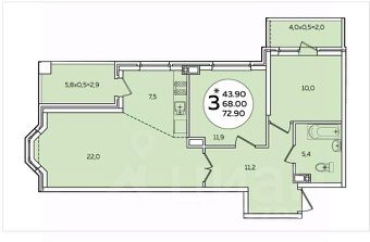 - жилая - 43,9 кв.м (две изолированные комнаты)