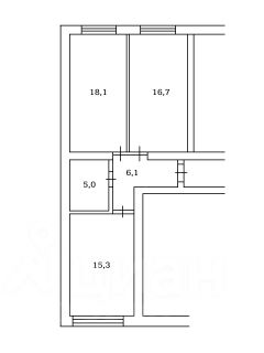 - жилая - 34,8 кв.м (две изолированные комнаты: 16,7 кв.м и 18,1 кв.м)