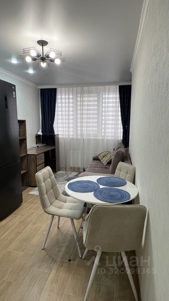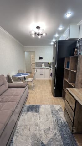 В кухне-гостиной: кухонный гарнитур, холодильник, индукционная варочная панель 2 конфорки, вытяжка, духовой шкаф, микроволновая печь. Обеденная группа с 3мя стульями. Зона гостиной с диваном, рабочим столом и стеллажом. Кондиционер.
