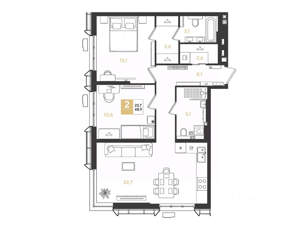 Срок сдачи: 3 кв. 2028, общей площадью 68.9 кв.м., на 2 этаже.