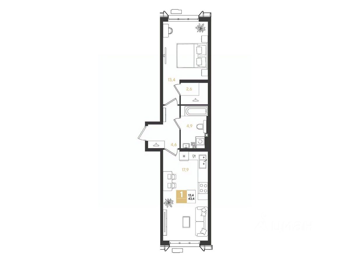 Срок сдачи: 3 кв. 2028, общей площадью 43.4 кв.м., на 2 этаже.
