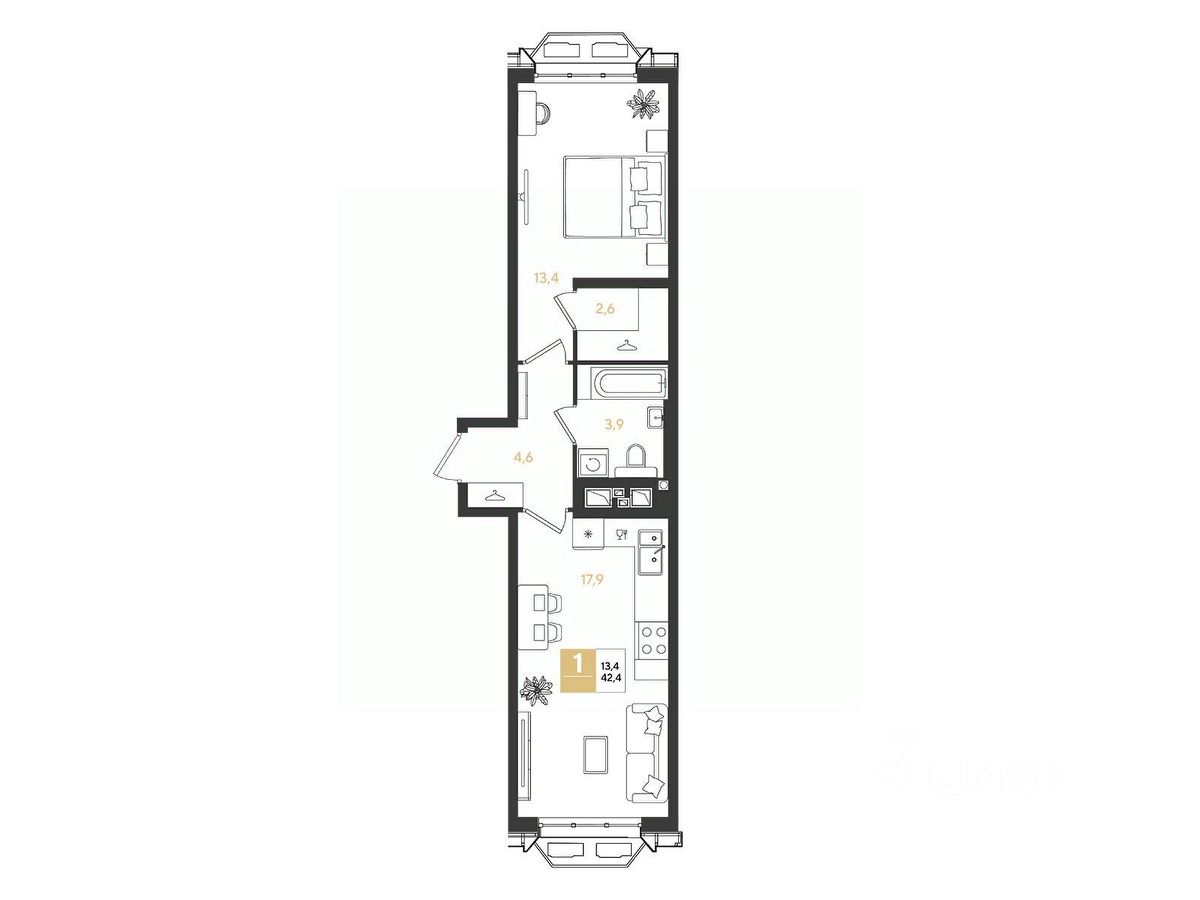 Срок сдачи: 3 кв. 2028, общей площадью 42.4 кв.м., на 5 этаже.