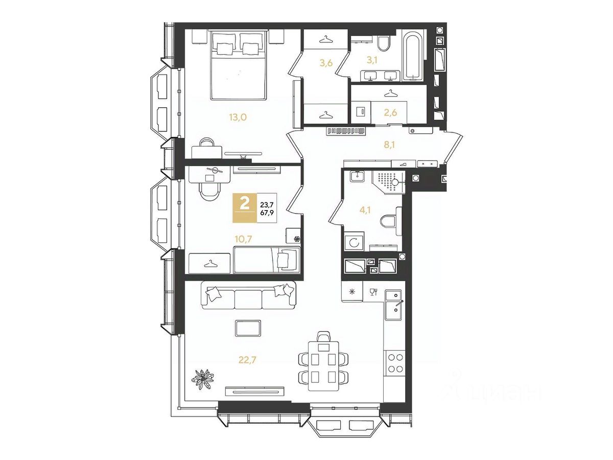Срок сдачи: 3 кв. 2028, общей площадью 67.9 кв.м., на 8 этаже.