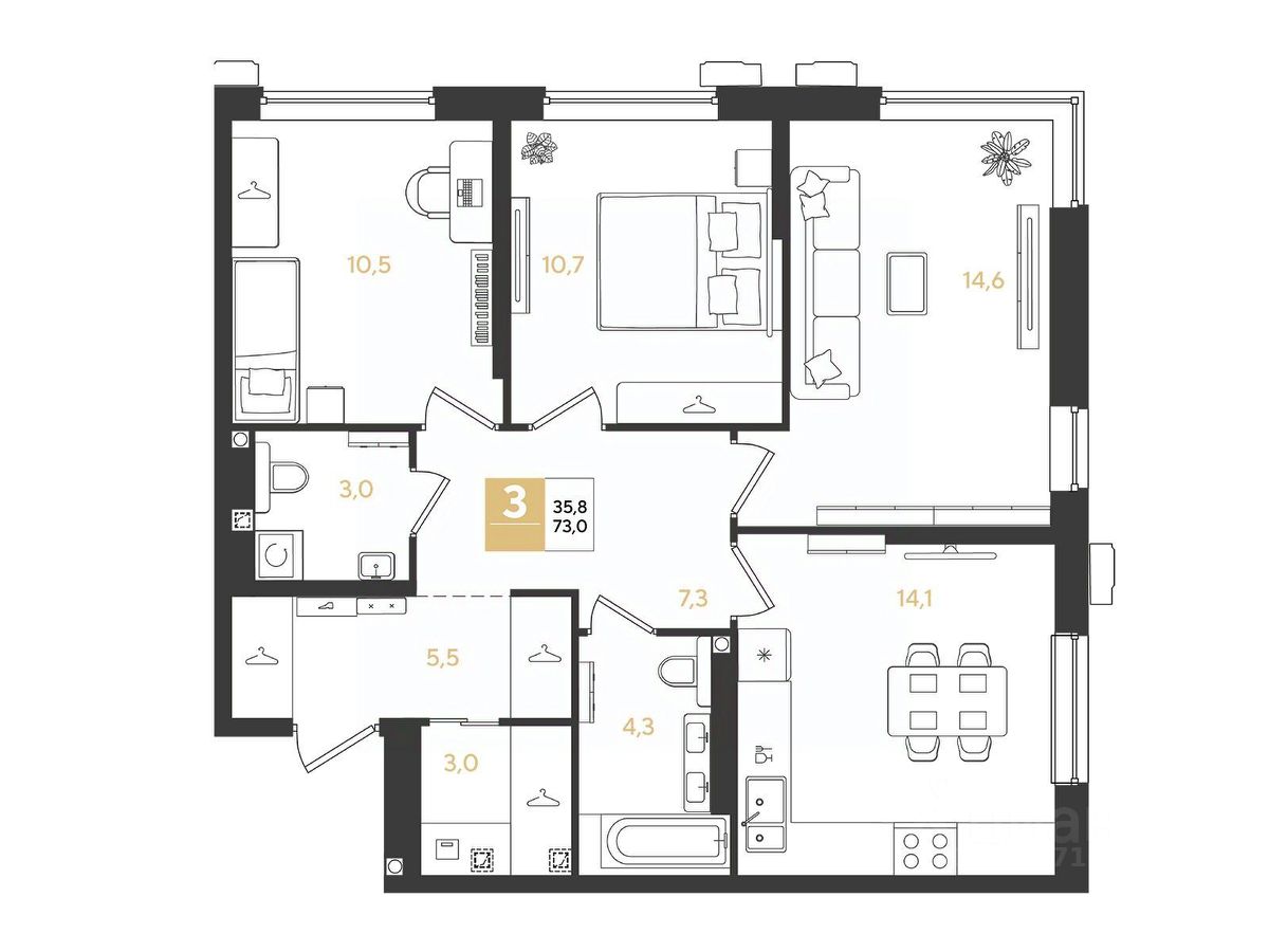 Срок сдачи: 3 кв. 2028, общей площадью 73 кв.м., на 2 этаже.