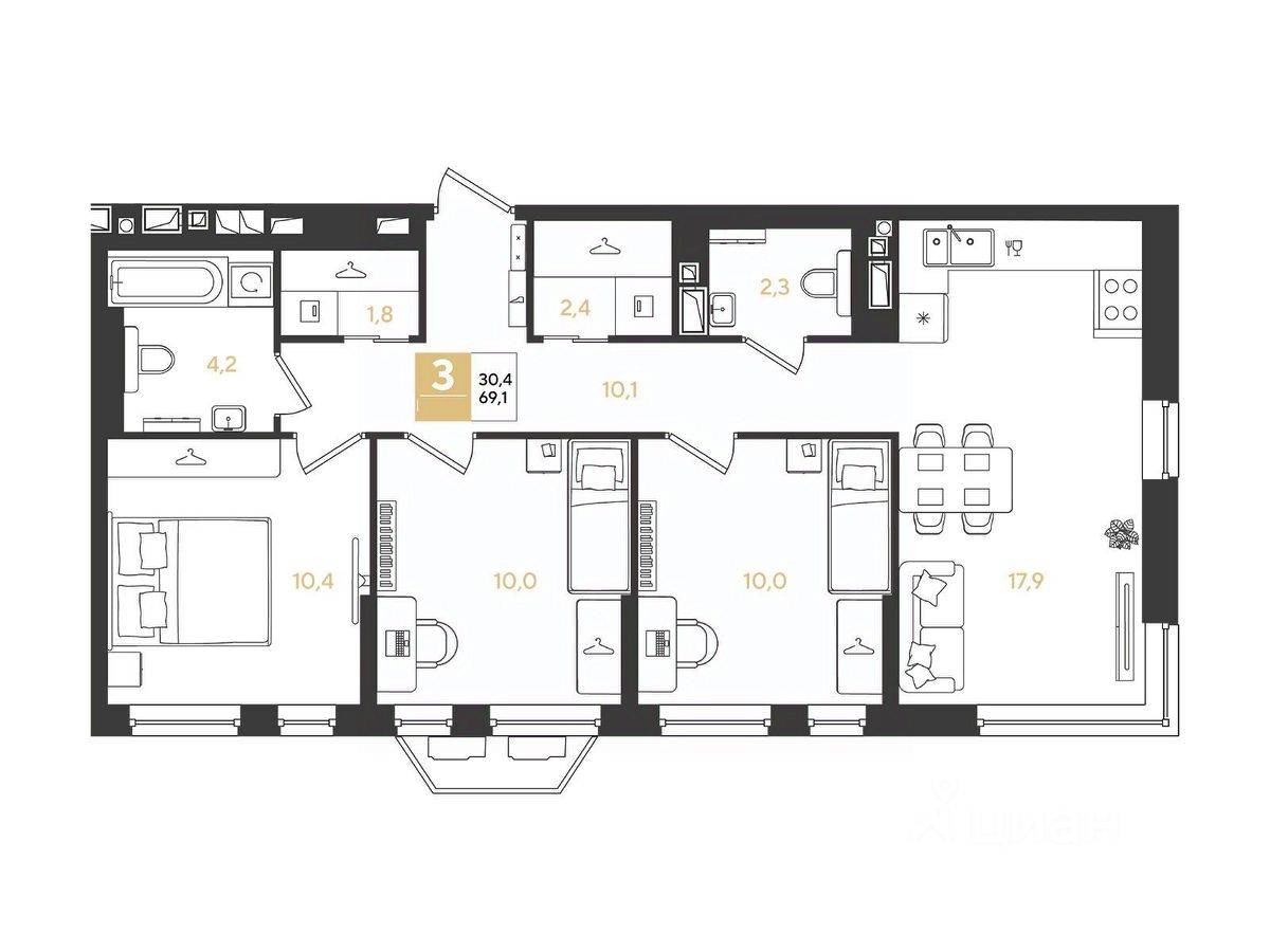 Срок сдачи: 3 кв. 2028, общей площадью 69.1 кв.м., на 4 этаже.