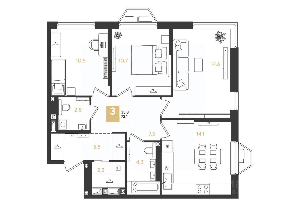 Срок сдачи: 3 кв. 2028, общей площадью 72.1 кв.м., на 8 этаже.