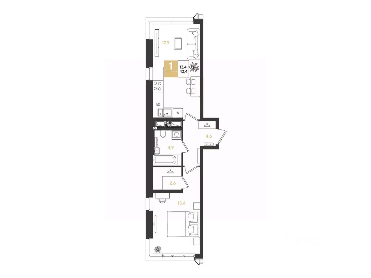 Срок сдачи: 3 кв. 2028, общей площадью 42.4 кв.м., на 15 этаже.