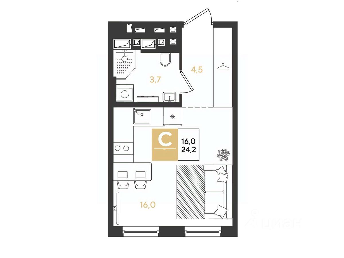 Срок сдачи: 3 кв. 2028, общей площадью 24.2 кв.м., на 4 этаже.