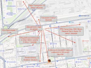 - остановка общественного транспорта рядом с домом, в пешей доступности конечная остановка трамвая и ж/д станция Краснодар-Сорт, ж/д станция Краснодар-1 всего 4 км., до Аэропорта 10 км.