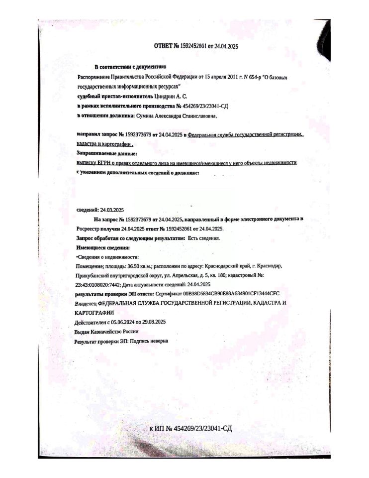 Д-к: Сумина А.С. Квартира, площадь 36,50 кв.м., кадастровый номер 23:43:0108020:7442. Адрес: Краснодарский край, г.Краснодар, ул.Апрельская, д.5, кв.180. Начальная цена 1 836 000 руб., задаток 1 836 руб., шаг аукциона 18 360 руб., ув. 1315