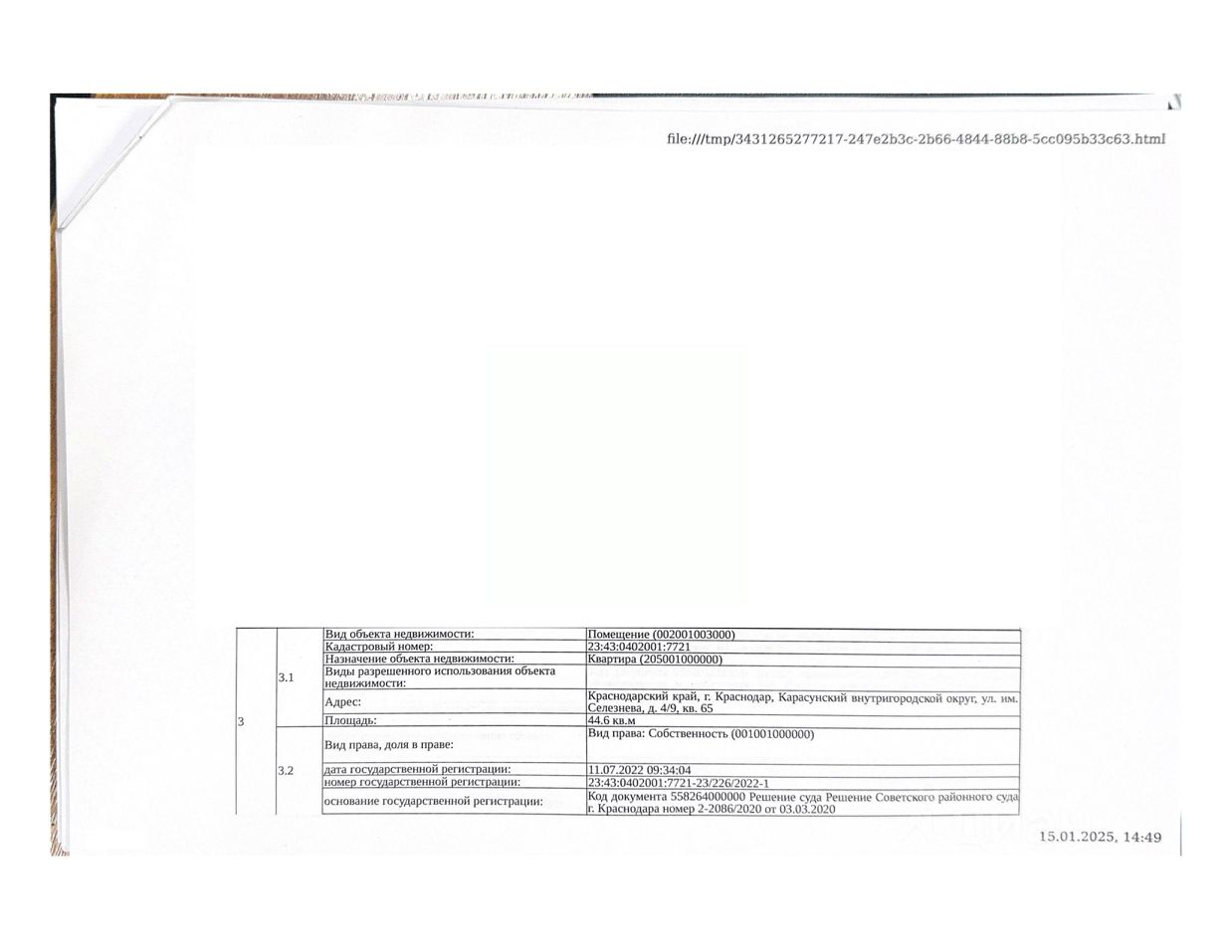 Лот 13 Д-к: Ромашка Н.А. Квартира, площадь 44,6 кв.м., кадастровый номер 23:43:0402001:7721. Адрес: Краснодарский край, Карасунский округ, ул. Селезнева, дом 4/9, квартира 65. Начальная цена 5 074 670 руб., задаток 761 201 руб., шаг аукциона 50 747 руб., ув.122