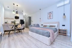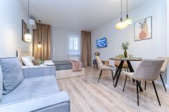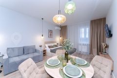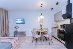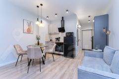 Квартира продумана до мелочей, в ней гармонично сочетаются современный дизайн и функциональность: имеется спальная и обеденная зона, а так же зона отдыха. Предусмотрено несколько вариантов освещения, что позволяет жильцам, находясь на одном пространстве, не мешать друг другу.