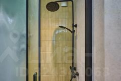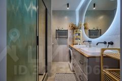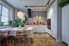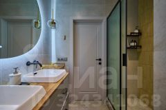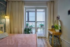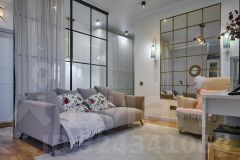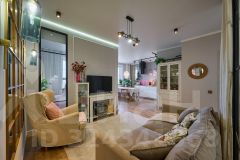 Интерьер выполнен в стильном эклектичном стиле с использованием высококачественных материалов. Каждая комната оснащена минимум тремя световыми зонами, что позволяет регулировать освещение в зависимости от настроения. Стеклянная перегородка между коридором и залом, выполненная на заказ, создает ощущение простора, а остекление в стене между комнатой и залом обеспечивает дополнительное дневное освещение. Кухня также изготовлена на заказ и укомплектована бытовой техникой Bosch.