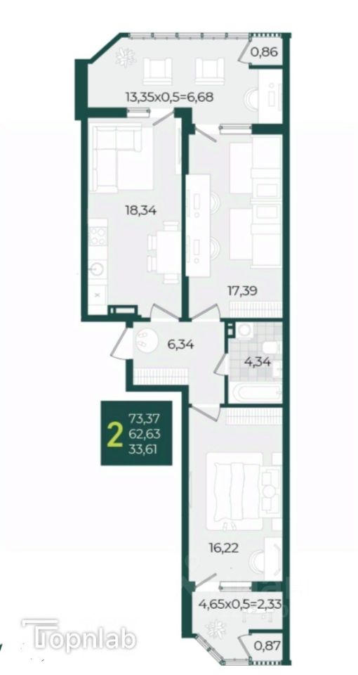 Две просторныеилоджии 4.65 м2 и 13.35 м2 станут отличным местом для отдыха, создания зимнего сада или уютного уголка для работы. Онии прекрасно освещены и остеклены