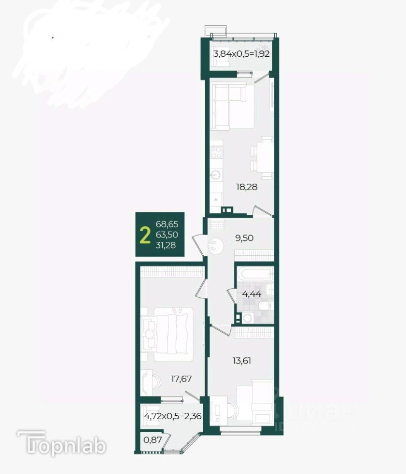 Просторные лоджии 3.84м2 и 4.72м2 стануь отличным местом для отдыха, создания зимнего сада или уютного уголка для работы. Онт прекрасно освещены и остеклены