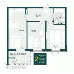 В продаже стильная 2 комнатная квартира с большой кухней 18,64м2.