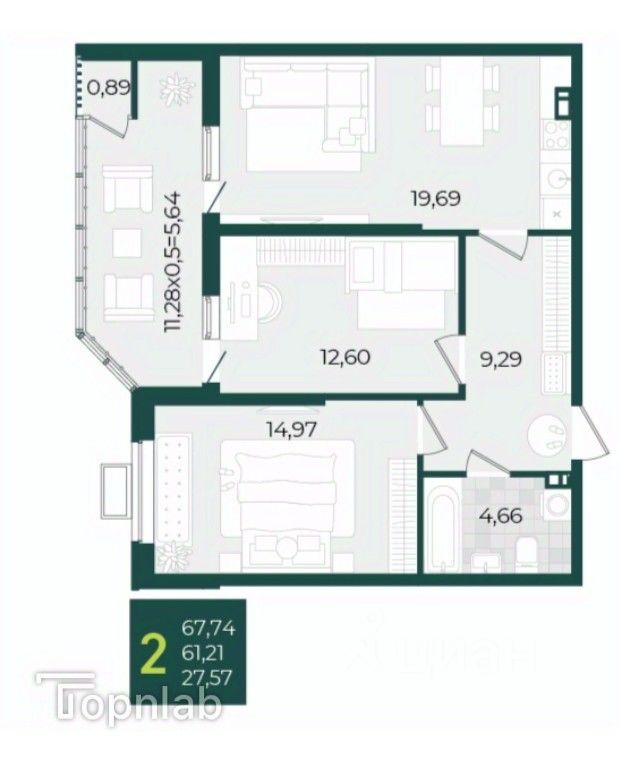 Просторная лоджия 11.28 м2 станет отличным местом для отдыха, создания зимнего сада или уютного уголка для работы. Она прекрасно освещена и имеет возможность остекления.