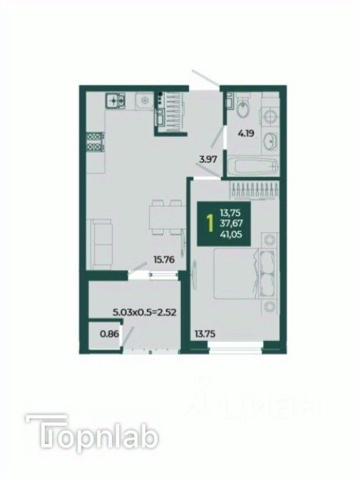В продаже стильная 1 комнатная квартира с большой кухней 15.76 м2 с выходом на лоджию 5.03 м2.