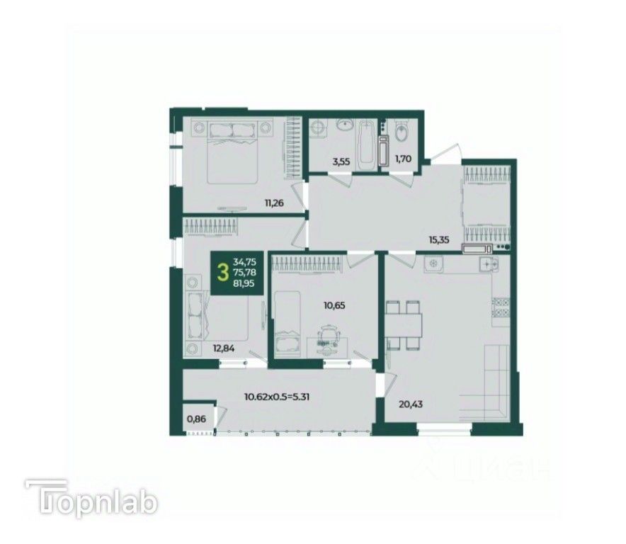 В продаже стильная 3 комнатная квартира с большой кухней 20.43 м2 с выходом на ленточную лоджию 10.62м2,прихожая 15.35 м2 с зоной для гардероба.