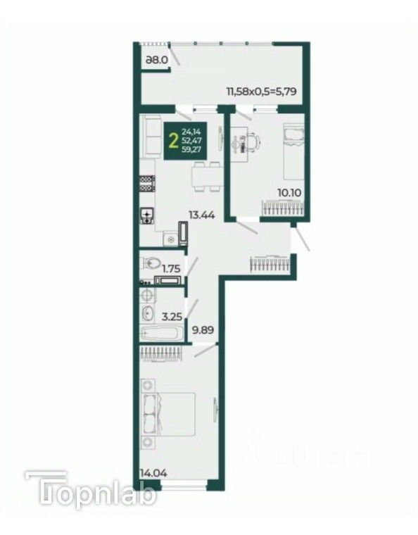 В продаже стильная 2 комнатная квартира с большой кухней 13,,44 м2 с выходом на ленточную лоджию 11,58 м2, прихожая 9,89 м2 с зоной для гардероба.