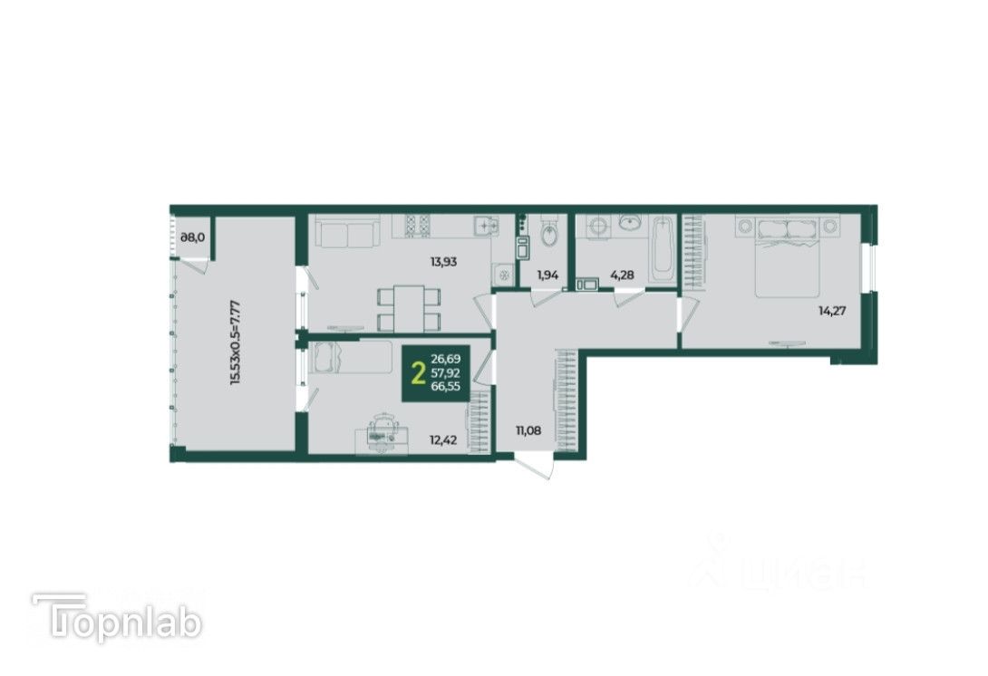 В продаже стильная 2 комнатная квартира с большой кухней 13,93 м2 с выходом на ленточную лоджию 15,53м2, прихожая 11,08 м2 с зоной для гардероба.