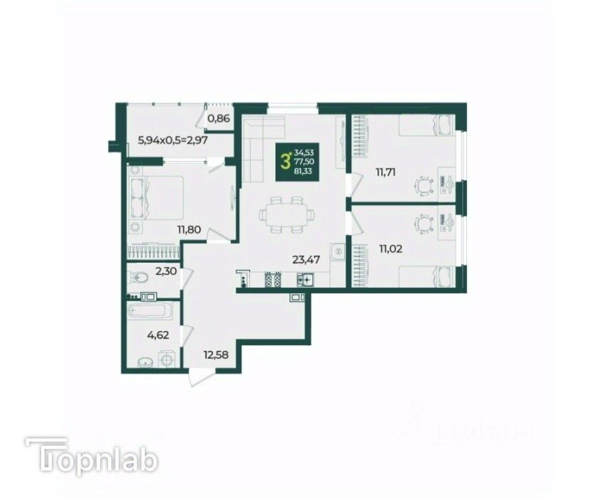 В продаже стильная 3 комнатная квартира с большой кухней 23,47 м2 ,прихожая 12,47 м2 с зоной для гардероба.