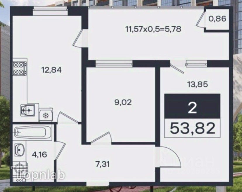 В продаже стильная 2 комнатная квартира с большой кухней 13,,44 м2 с выходом на ленточную лоджию 11,58 м2, прихожая 9,89 м2 с зоной для гардероба.