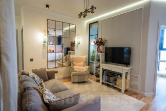 - В квартире 2 изолированные спальни с выходом на балкон, уютная гостиная, кухня, гардеробная и совмещенный санузел.