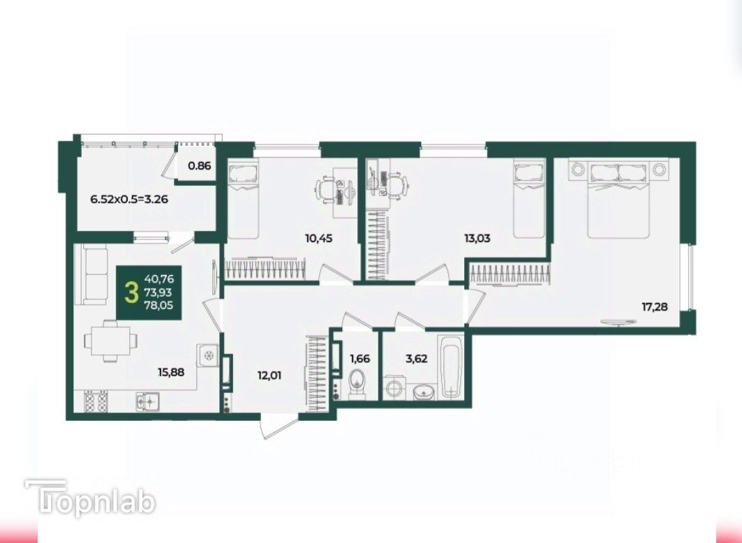 Лоджия 6,52м2 станет отличным местом для отдыха, создания зимнего сада или уютного уголка для работы. Она прекрасно освещена и остеклена