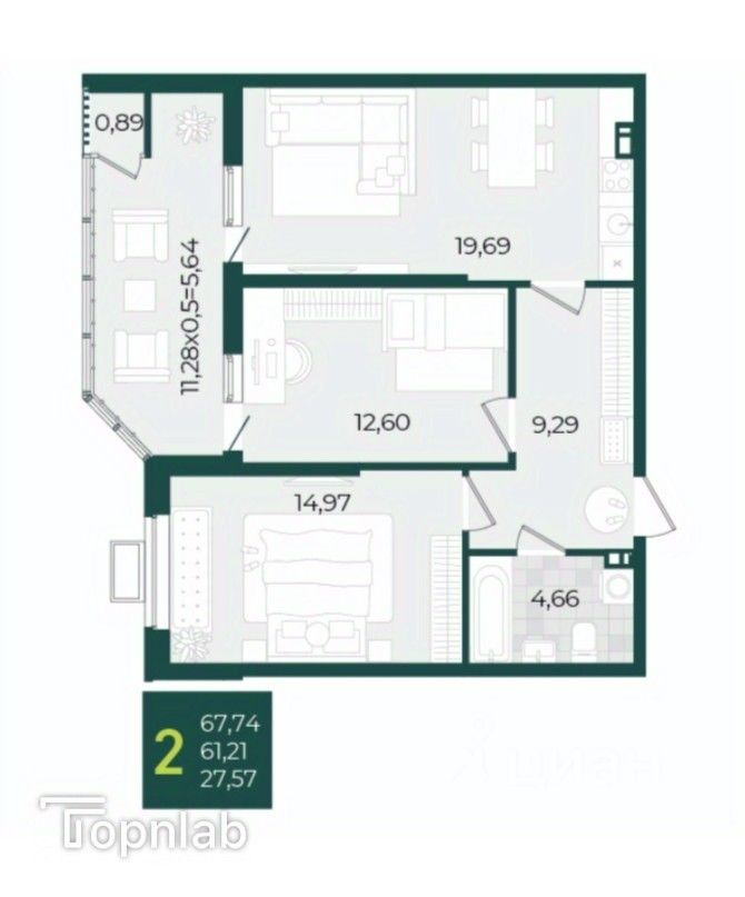 Просторная лоджия 11.28 м2 станет отличным местом для отдыха, создания зимнего сада или уютного уголка для работы. Она прекрасно освещена и остеклена