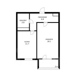 Широкая кухня 11,7 м2. изолированная комната 18 м2, совмещенный санузел 3,8 м2 с душевой зоной.