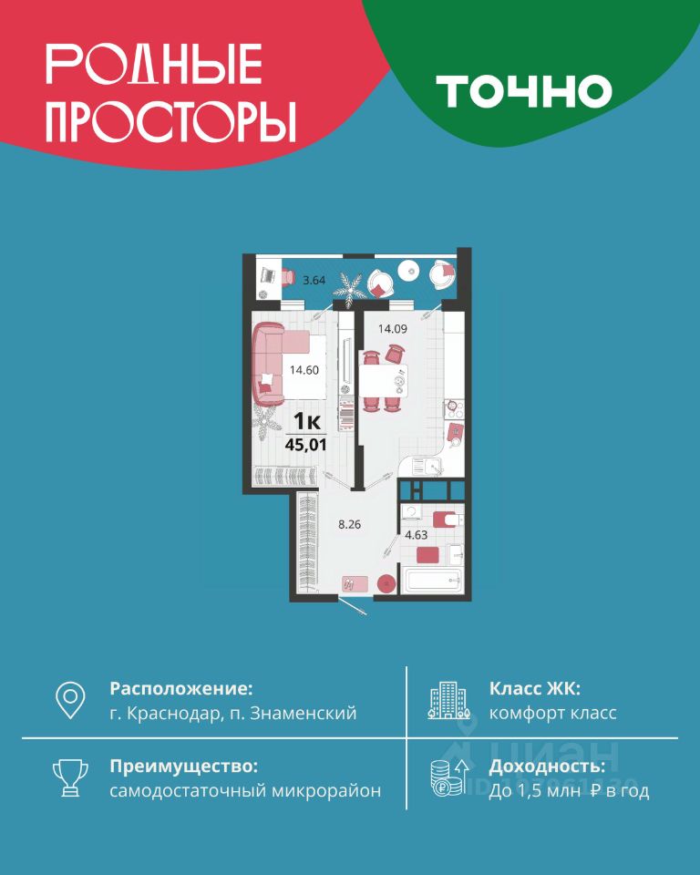 "Родные просторы"- самодостаточный микрорайон, который реализован по принципу комплексного развития территории, где есть вся инфраструктура для комфортной жизни. На территории 41 га 29 домов от 9 до 24 этажей, уютные дворы со спортивными и игровыми площадками, социальные и коммерческие объекты, зеленые массивы и фонтаны. Главная точка притяжения "Родных просторов" - парк семейного отдыха площадью 9 га, 4,5 км прогулочных аллей, амфитеатр для мероприятий, кинофестивальная площадка. Особая гордость микрорайона современная школа на 1550 мест и 3 детских сада "Ладушки", "Веснушки" и "Топотушки" на 880 малышей. В центре микрорайона строятся фитнес-клуб BALANCE с акватермальным комплексом и собственная поликлиника, площадью более 5000 кв.м. Уже открыт православный храм Святых Первоверховных апостолов Петра и Павла.