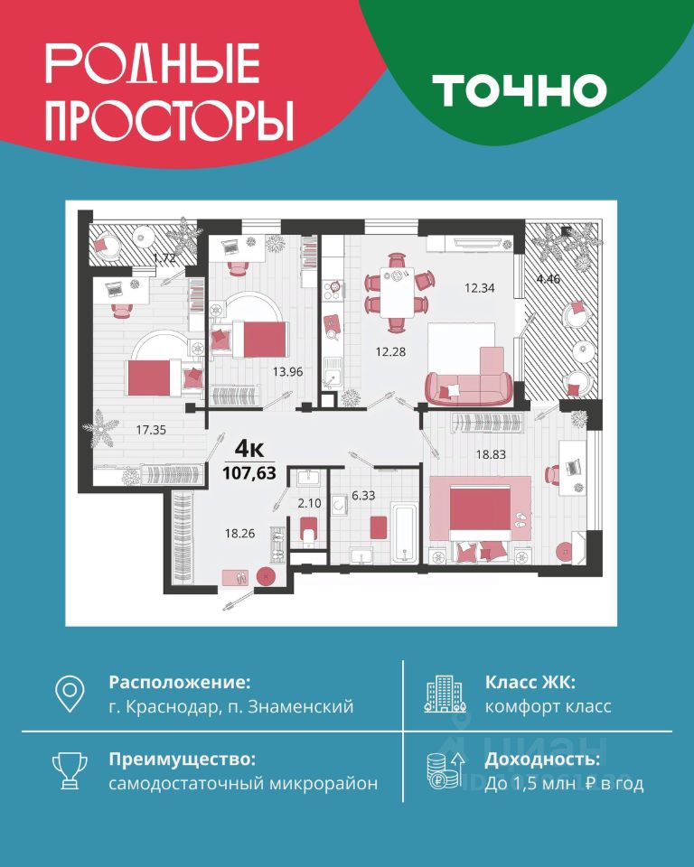 "Родные просторы"- самодостаточный микрорайон, который реализован по принципу комплексного развития территории, где есть вся инфраструктура для комфортной жизни. На территории 41 га 29 домов от 9 до 24 этажей, уютные дворы со спортивными и игровыми площадками, социальные и коммерческие объекты, зеленые массивы и фонтаны. Главная точка притяжения "Родных просторов" - парк семейного отдыха площадью 9 га, 4,5 км прогулочных аллей, амфитеатр для мероприятий, кинофестивальная площадка. Особая гордость микрорайона современная школа на 1550 мест и 3 детских сада "Ладушки", "Веснушки" и "Топотушки" на 880 малышей. В центре микрорайона строятся фитнес-клуб BALANCE с акватермальным комплексом и собственная поликлиника, площадью более 5000 кв.м. Уже открыт православный храм Святых Первоверховных апостолов Петра и Павла.