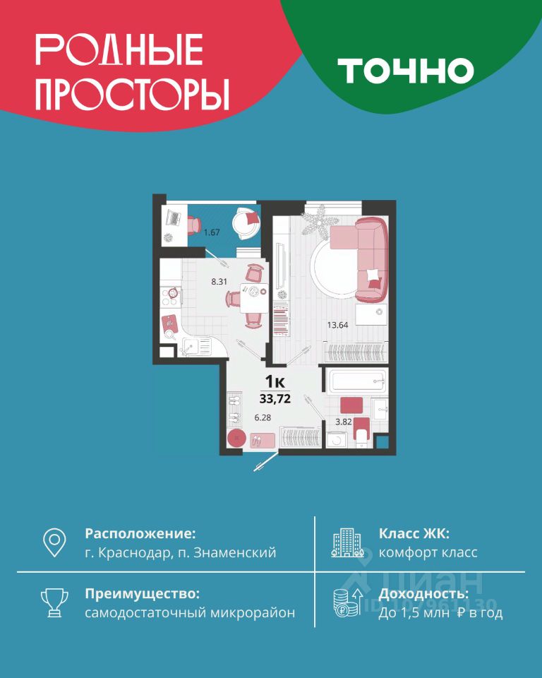 "Родные просторы"- самодостаточный микрорайон, который реализован по принципу комплексного развития территории, где есть вся инфраструктура для комфортной жизни. На территории 41 га 29 домов от 9 до 24 этажей, уютные дворы со спортивными и игровыми площадками, социальные и коммерческие объекты, зеленые массивы и фонтаны. Главная точка притяжения "Родных просторов" - парк семейного отдыха площадью 9 га, 4,5 км прогулочных аллей, амфитеатр для мероприятий, кинофестивальная площадка. Особая гордость микрорайона современная школа на 1550 мест и 3 детских сада "Ладушки", "Веснушки" и "Топотушки" на 880 малышей. В центре микрорайона строятся фитнес-клуб BALANCE с акватермальным комплексом и собственная поликлиника, площадью более 5000 кв.м. Уже открыт православный храм Святых Первоверховных апостолов Петра и Павла.