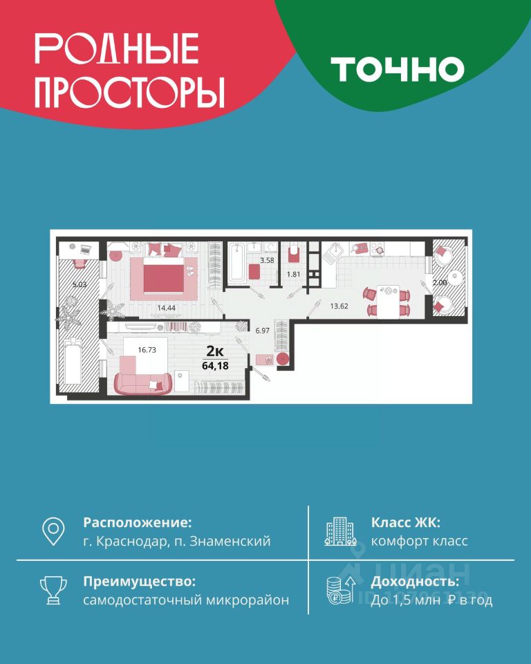 "Родные просторы"- самодостаточный микрорайон, который реализован по принципу комплексного развития территории, где есть вся инфраструктура для комфортной жизни. На территории 41 га 29 домов от 9 до 24 этажей, уютные дворы со спортивными и игровыми площадками, социальные и коммерческие объекты, зеленые массивы и фонтаны. Главная точка притяжения "Родных просторов" - парк семейного отдыха площадью 9 га, 4,5 км прогулочных аллей, амфитеатр для мероприятий, кинофестивальная площадка. Особая гордость микрорайона современная школа на 1550 мест и 3 детских сада "Ладушки", "Веснушки" и "Топотушки" на 880 малышей. В центре микрорайона строятся фитнес-клуб BALANCE с акватермальным комплексом и собственная поликлиника, площадью более 5000 кв.м. Уже открыт православный храм Святых Первоверховных апостолов Петра и Павла.